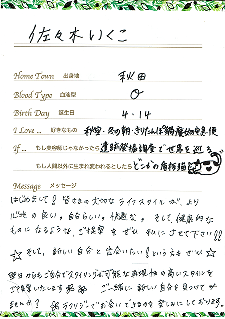 | トップページ | プライス | キャンペーン | アクセスマップ | サロンコンセプト | スタッフ紹介 | ヘアスタイル | メンズメニュー | ブログ ネット予約 | ヘアセットスタイル | まつ毛エクステ | ヘアドネーション | スタッフ募集 | facebook | Twitter | YOU TUBE | リンク | サイトマップ |